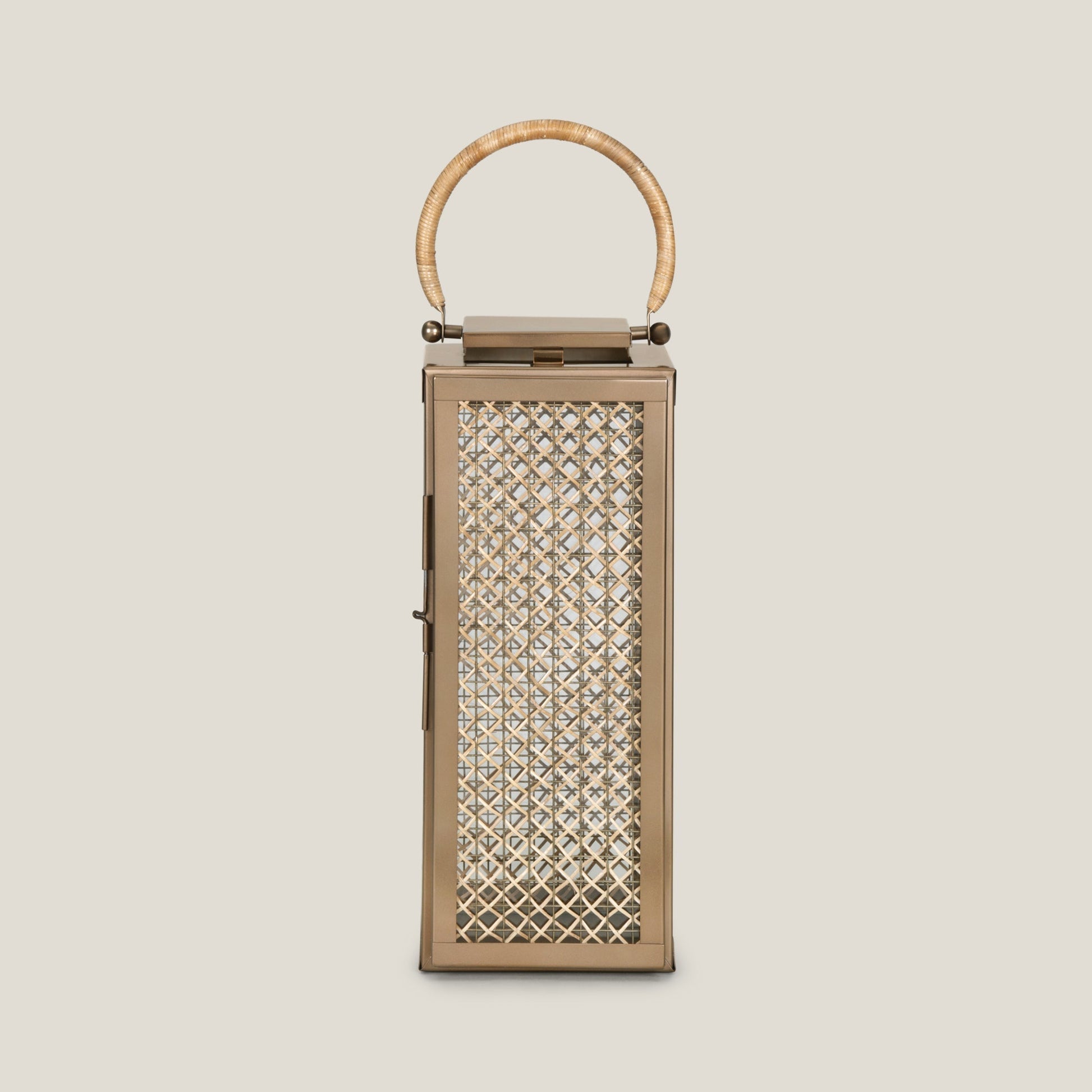 Our Catalina Lantern draws inspiration from antique Japanese Rattan furniture, blending timeless craftsmanship with contemporary elegance. Its stainless steel body boasts a rich gold finish, while the four sides are adorned with meticulously hand-woven cane strips, creating a delicate wicker weave pattern over a sturdy metal mesh. This exquisite lantern serves as both a functional piece and a stunning decor accent.
