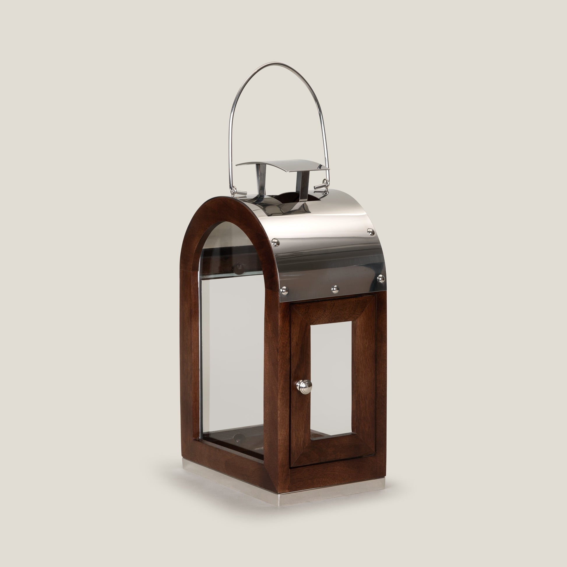 Our Lorient Lantern blends modern elegance with timeless charm. Featuring a sleek arc top with a polished stainless steel hood and a geometric wooden body with clean lines, this lantern exudes contemporary sophistication. Perfect for adding a touch of glamour to luxe homes, it seamlessly enhances both indoor and outdoor decor.